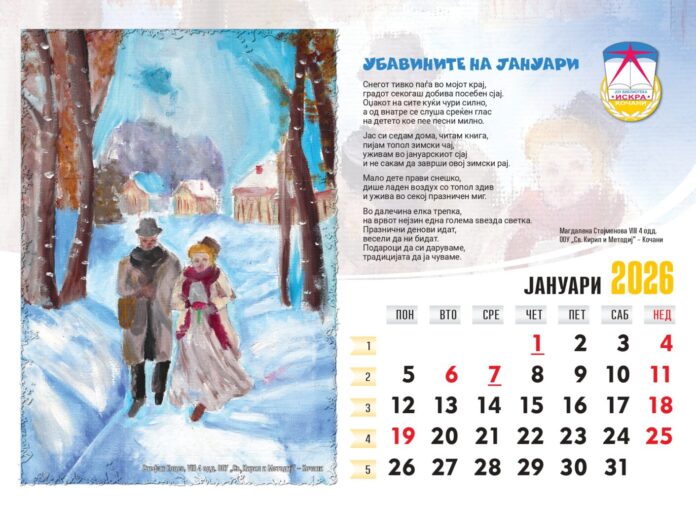 Бидејќи се наоѓаме во првиот месец од 2026 година, ви ја прикажуваме првата страница од овој креативен календар, збогатен со песната „Убавините на јануари“ од ученичката Магдалена Стојменова, со фотографија на ученикот Стефан Коцев и ученици во ООУ „Кирил и Методиј“ во Кочани.