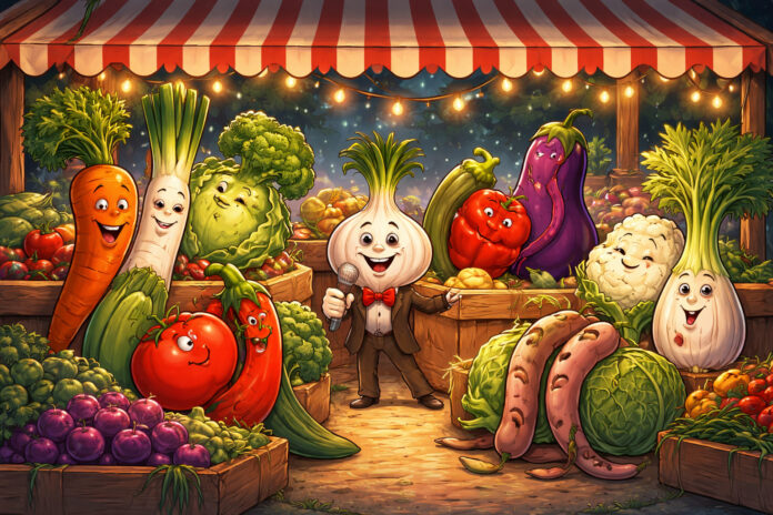 Учествуваат: Конферансието, Морковот, Празот, Црвениот Домат, Лукот, Модриот Патлиџан, Гравот и Целерот
