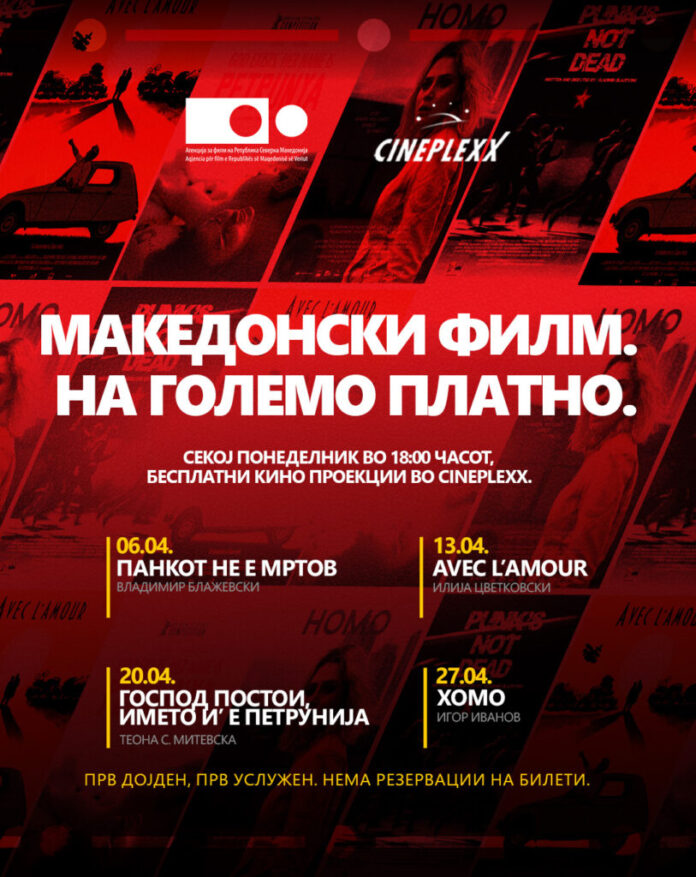 Секој понеделник, во 18 часот, љубителите на седмата уметност ќе имаат можност да проследат селекција од најзначајните македонски филмови во професионални киноуслови, а влезот ќе биде бесплатен по принципот „прв дојден, прв услужен“, без претходна резервација на билети. Програмата за април започнува со „Панкот не е мртов“ во режија на Владимир Блажевски (6 април), кој оваа година одбележува 15 години од својата премиера, по што следуваат „Avec L’amour“ во режија на Илија Цветковски (13 април), „Господ постои, името ѝ е Петрунија“ во режија на Теона С. Митевска (20 април) и „Хомо“ во режија на Игор Иванов (27 април).