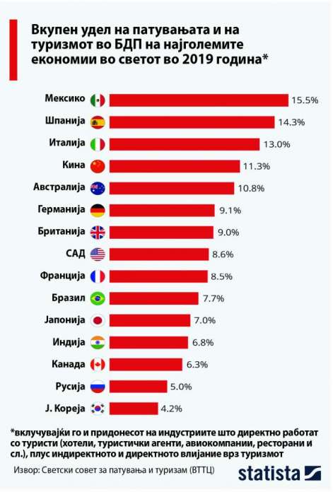 Податоците од Светскиот совет за патувања и туризам (ВТТЦ) покажуваат дека патувањата и туризмот учествувале со 14,3 и 13 отсто во БДП на Шпанија и на Италија минатата година, вклучувајќи ги и директните приходи од хотелите, туристичките агенти, авиокомпаниите, рестораните и друго, како и огромните суми од милијарди долари што туристите ги носат на нивните брегови. На пример, во САД вкупното влијание на патувањата и туризмот беше значително помало, со 8,6 отсто од БДП. Дури и со таквата пониска стапка, патувањата и туризмот директно поддржуваат повеќе од шест милиони работни места во САД, при што вкупниот придонес во однос на вработувањата изнесува 16,8 милиони работни места во САД, според ВТТЦ.