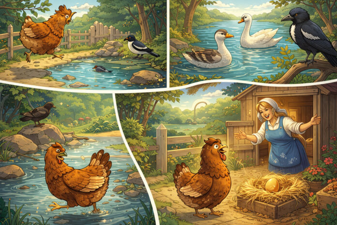 – кокошка покрај река,