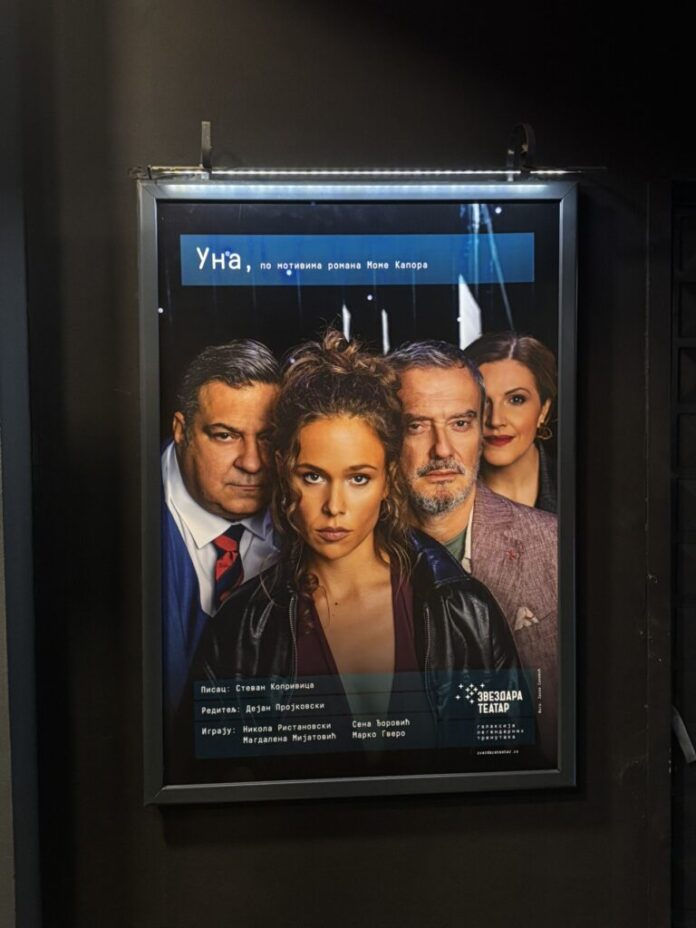 Култниот роман „Уна“ од 1981 година на Момо Капор, вo Белград, доби сосема ново, модерно театарско руво, благодарејќи на исклучително добро уиграната екипа, Дејан Пројковски како режисер на претставата, Никола Ристановски во главната машка улога, како проф. Мишел Бабиќ, Валентин Светозарев како сценограф и Горан Трајковски како автор на музичките теми.
