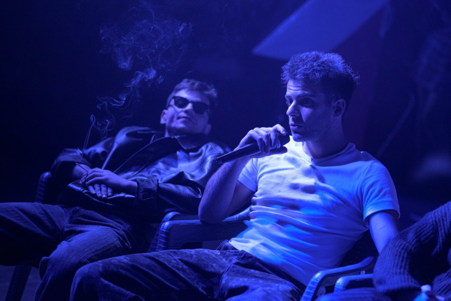 Сите ние имаме своја должност во судбинските текови на нашето битисување. Она што го иницира недоразбирањето е нашето сфаќање за одлучноста и способноста да се поврземе со другите и да станеме релевантна единка во општеството и во одредена социјална структура. Пиесата на Брајан Рејнолдс, „Сина сенка“, се занимава токму со човечкиот капацитет да го разбере својот долг кон општеството и својот ангажман пред сè кон цивилизацијата што самиот ја креира. Навлегувајќи во неколку општествени структури и појави, овој текст има длабока филозофска сонда, сјајна феноменолошка студија на човечкиот дух и специфична онтолошка присутност. Овде ми се наметнува една сентенца на големиот германски драматичар и поет Јохан Волфганг Гете, која гласи: „Начинот на кој ги гледаш луѓето е начинот на кој се однесуваш со нив, а начинот на кој се однесуваш со нив е она што тие стануваат“. Во оваа пиеса низ медиумската мрежа и мафијашката доминација се отвора голем егзистенцијален проблем: проблемот на опстојувањето на човекот низ фармаколошките соединетости. Колку и да изгледа сето ова наслоено со значења, овие три струи креираат театарски чин, кој одушевува не само со режисерската елоквентност туку и со актерската енергија. Оваа драмска фуга на Брајан Рејнолдс низ призмата на режисерската концепција на Тамара Стојаноска се случува во мракот на црната кутија каде што се обидуваат да преживеат сите оние што ги зафатила бурата на човечката недореченост. Стојаноска контекстуализира една исклучително динамична сценска изведба каде што сите животни ситуации и сите карактери се во едно чистилиште, обидувајќи се да го оправдаат својот животен позив, да не станат жртва на медиумската искривоколченост, но и на интимните несреќи. Филозофски детерминиран, овој концепт сјае со својата компактност, со својата извонредна позиционираност во недефиниран простор, кој можеме да го замислиме и како телевизиско студио, но и како дневна соба, крчма во која се сретнуваат мафијашките босови, ресторан, а и чист, празен простор, кој е место за осамата на Џои Мацони, за неговото лудило и суицидност. Оваа талентирана режисерка на многу чуден начин го доближува драмскиот текст до публиката иако дејствието стриктно се случува во Америка. Џои Мацони е повремено дел од публиката, сите рекламни пасажи постануваат дел од публиката, а публиката станува дел од дејствието препознавајќи ја тажната и сурова емигрантска судбина. Низ тој триаголник, уште на самото влегување, публиката се замешува со актерите чија вознемиреност е само очигледен напор да го исправат патот кон логиката и смиреноста, а тоа вмешување е само почеток на една многу продуктивна и социјално многу силно детерминирана интерактивност. Жестока докрај, до последниот миг, нејзината режисерска поставеност е вивисекција на современото лудило под влијание на медиумите и цивилизациските недоразбирања и небрежности.