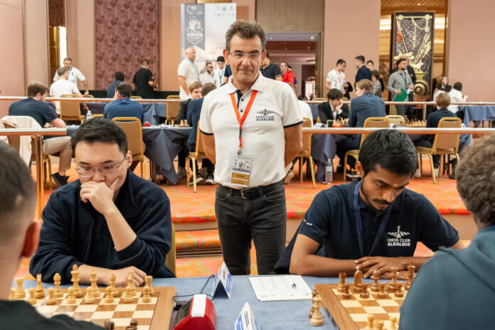 Рауф Мамедов (2.655) ги водеше белите фигури на првата табла против Арјун Еригаиси (2.773), при што индискиот велемајстор кој настапува за ШК Алкалоид одбра да се брани со ризично кралско фијанкето, кое е своевиден бренд на азербејџанската шаховска школа. Еригаиси играше одлично и успеа да создаде мала предност, но, сепак, не успеа да ја реализира и во завршницата го подели поенот.