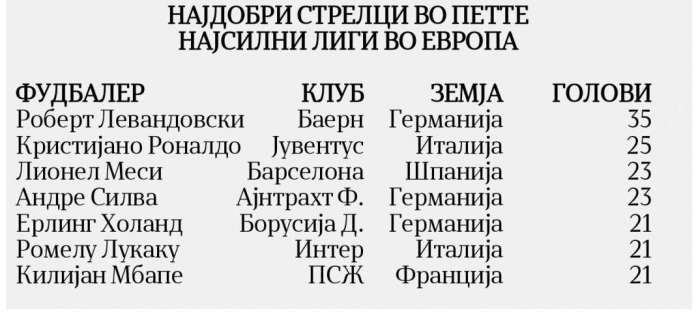 Трката за „златната копачка“, наменета за најдобриот стрелец во фудбалска Европа за сезоната 2020/2021, влегува во завршницата. Најдобрите напаѓачи во Европа, како Роберт Левандовски, Кристијано Роналдо, Лионел Меси, но и Ерлинг Холанд, Мохамед Салах, се во трка за детронизација на Чиро Имобиле, кој лани беше најефикасен со 36 гола, пишува на интернет-страницата на Европската фудбалска унија (УЕФА).