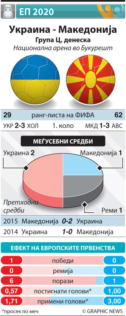 За Македонија мечот против Украина попладнево (15 часот) на арената „Национал“ во Букурешт е решавачки за натамошниот тек на фудбалското Европско првенство (ЕП). На Македонија ѝ е потребна победа или барем реми за какви било бодовни калкулации и пласман што води во осминафиналето, по поразот од Австрија (1-3) во првото коло. Во слична ситуација се и Украинците, кои во премиерниот меч беа поразени од Холандија со 2-3, па оттаму за очекување е овој натпревар да понуди многу неизвесност и возбудувања.