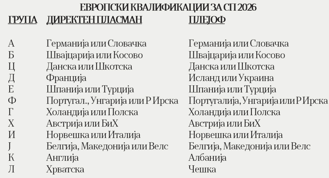 - Македонија утре со Велс ќе игра и за директен пласман на своето прво СП, што зависи и од резултатот на мечот Белгија – Лихтенштајн. Македонската селекција обезбеди место во доигрувањето за СП 2026 преку Лигата на нациите, со што би била во четвртиот барабан за ждрепката в четврток, но може во плејофот да се пласира и преку второ место во квалификациската група, за место во еден од првите три барабани. Македонија играше во плејфот и за СП 2022, а ова би бил вкупно трет бараж на црвено-жолтите, откако преку таа патека се пласира на дебитантското ЕП, во 2021 година