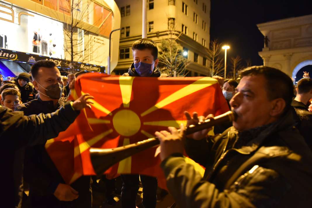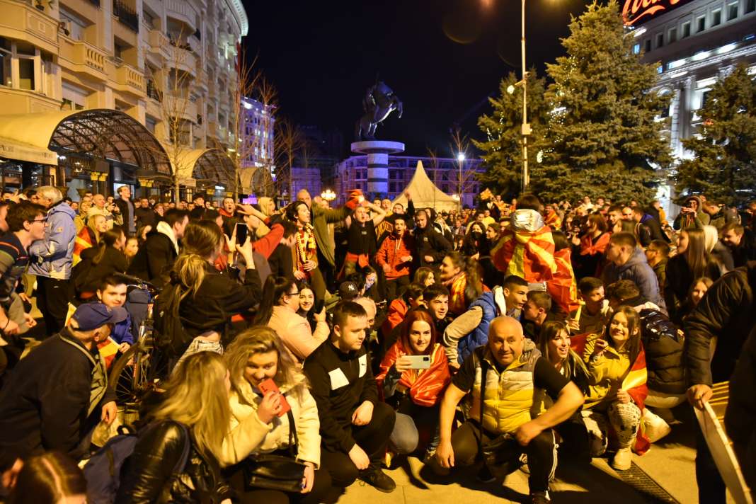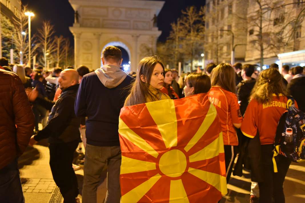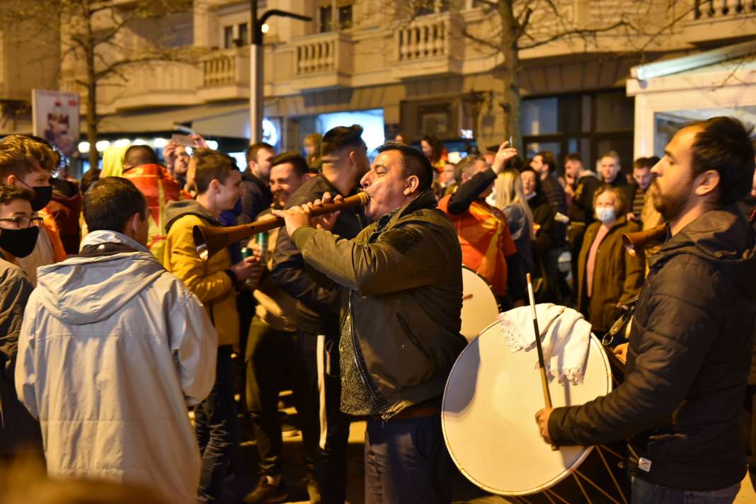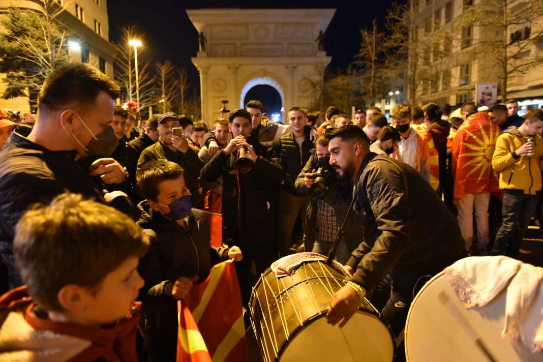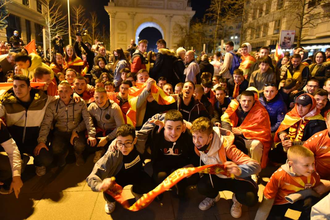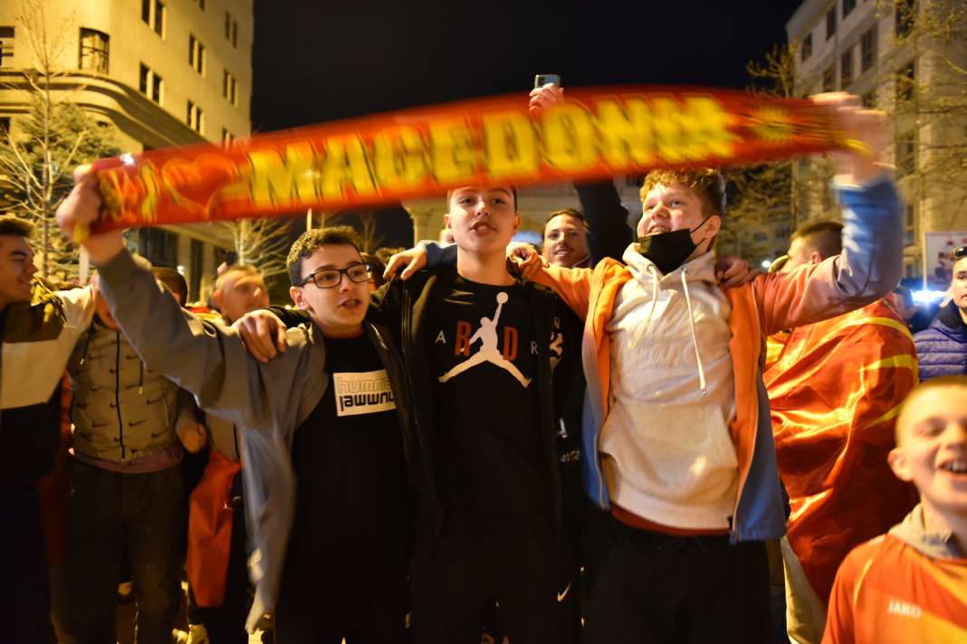 Автобусот со македонските фудбалери помина низ Порта Македонија за да стигне пред љубителите на спортот кои со песни и знамиња го славеа триумфот над актуелниот европски првак Италија, додека се слушаа и зурли и тапани.