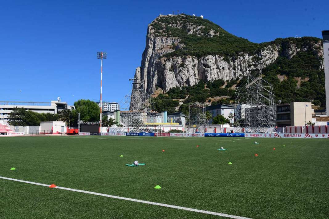 Стадионот Викторија е еден од поуникатните во Европа зашто е сместен веднаш до пистата на која полетуваат и слетуваат авионите во Гибралтар. Токму за време на тренингот полета авионот за Лондон, но и тоа не беше пречка нашиот национален тим да се подготвува за утрешниот предизвик.
