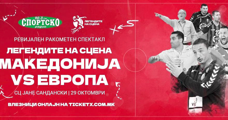 Под мотото „Легендите на сцена“, денеска (од 19 часот), во СЦ „Јане Сандански“ во Скопје, ќе се одржи ревијален ракометен спектакл во организација на Спортско радио 90,3 ФМ, кое годинава слави 20 години од своето постоење. За таа пригода, тие одлучија да организираат ревијален ракометен натпревар на македонските легенди против европските, со многу поранешни познати македонски и странски играчи, но и тренерски ѕвезди, кои играле и воделе клубови еден период во Македонија.
