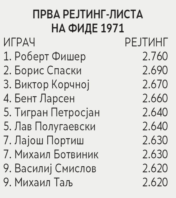 Во 1971 година ФИДЕ ја објави својата прва листа на рејтинзи. Американецот Роберт Фишер со 2.760 поени беше единствениот играч со рејтинг над 2.700. По него следуваше тогашниот актуелен светски шампион, Русинот Борис Спаски со 2.690. Тринаесет други велемајстори беа над границата од 2.600 рејтинг-поени. Фреквенцијата на објавување на рејтинг-листата на ФИДЕ се менуваше со текот на времето. Од 1971 до 1980 година, се издаваше само една листа годишно. Ова постепено се зголемуваше до сегашниот стандард на месечни ажурирања. Рејтинзите генерираа фасцинантна статистика. Највисокиот постигнат рејтинг му припаѓа на 16-от светски шампион по ред, Норвежанецот Магнус Карлсен, кој достигна неверојатна височина од 2.882 поени. Само 14 други играчи во историјата го преминале прагот од 2.800. За да се квалификува за титулата велемајстор, шахистот мора да достигне рејтинг од 2.500 поени, пишува ФИДЕ.
