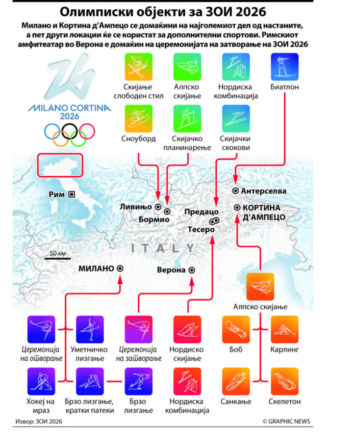 Италија се подготвува да биде домаќин на Зимските олимписки игри (ЗОИ) в година, двата главни кластери на Игрите се Милано, центар на индустрискиот север на Италија, и Кортина д’Ампецо, луксузно зимско одморалиште во планинскиот венец Доломити. Спортистите ќе се натпреваруваат и во три други планински кластери, а церемонијата на затворање ќе се одржи во Верона. За ЗОИ 2026 претежно ќе се користи постојната инфраструктура, а некои места се реновираа или се градеа од нула, пишува агенцијата „Асошиејтед прес“ (АП).
