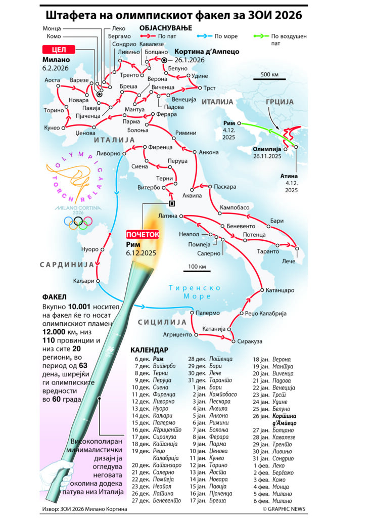 Од 6 декември до 6 февруари 2026 година, денот на церемонијата на отворање на ЗОИ 2026, на олимпискиот стадион во Милано, олимпискиот пламен ќе има возбудливо патување низ Италија.