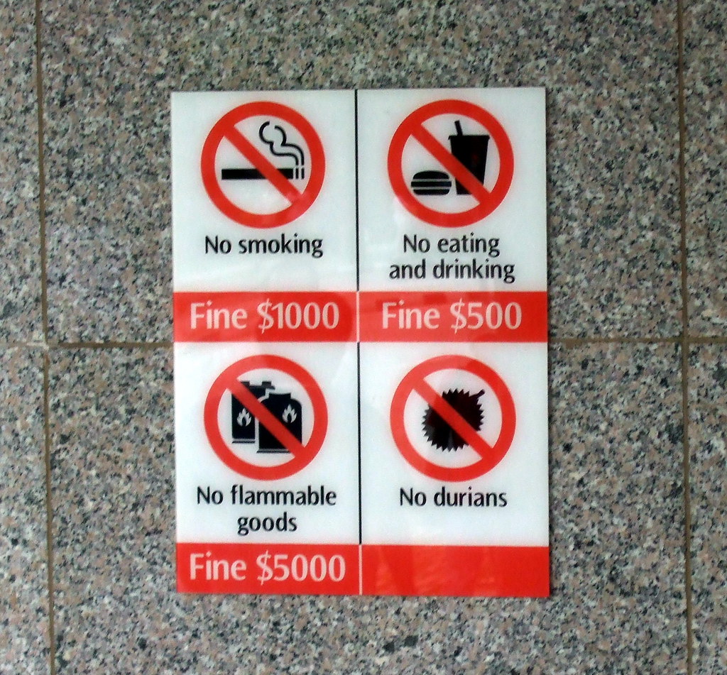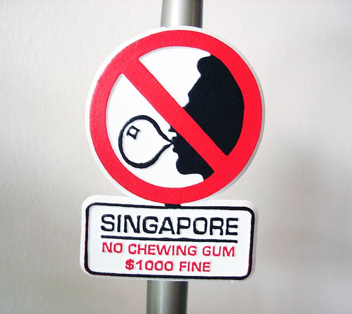 Продажбата на гума за џвакање е забрането, а казната може да биде висока со 100.000 долари или затворска казна од две години. Свирењето на инструмент на јавно место на начин што предизвикува или може да предизвика навреденост на било кое лице е казниво до 1.000 долари.