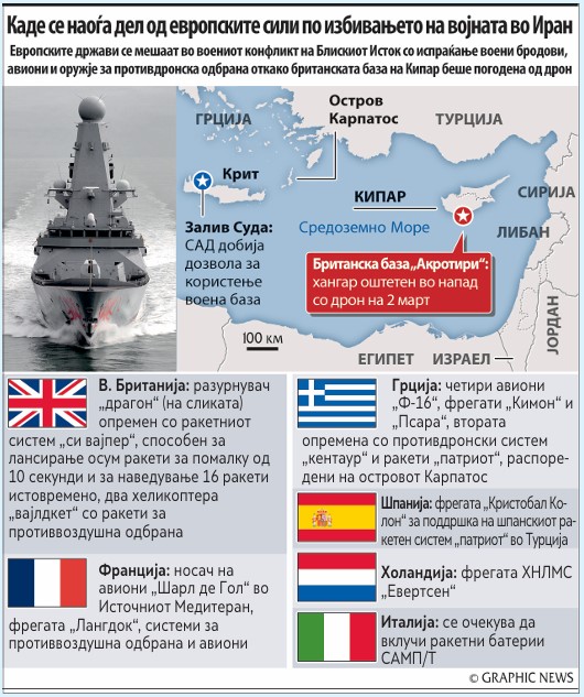 - Неколку европски земји, ниту прашани, ниту засегнати, со намера да се претстават дека сѐ уште се „фактор на големата светска шаховска табла за војна и мир“ испратија воени сили поблиску до военото жариште – Иран, имено во Средоземјето, лоцирајќи ги кај својата ЕУ-членка, Кипар. Европејците, предводени од Велика Британија, сакаат да демонстрираат солидарност заради некаква „заштита на Кипар“ од евентуални возвратни напади од страна на Техеран. Европејците се длабоко претпазливи од тоа да не бидат директно инволвирани во конфликтот во Иран, бидејќи се длабоко немоќни заради прокси-војната што ја водат против Русија во Украина. Иран би значел ангажирање на Европа на „два фронта“, а таа не може да излезе накрај ниту со еден. Сепак во Брисел решиле „да ѕиркаат“ потскриени од некаде, за да видат од поблиску што се случува на Блискиот Исток