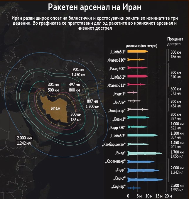 - Западните сили го сметаат иранскиот балистички ракетен арсенал за конвенционална воена закана за стабилноста на Блискиот Исток и потенцијален механизам за испорака на нуклеарно оружје, доколку Техеран некогаш одлучи да го развие. Иран, пак, постојано негира дека има намера да изработи атомски бомби. За потсетување, балистичкиот проектил е ракетно оружје што се наведува во фазата на искачување, а потоа најголемиот дел од летот го минува по патека на слободен пад, носејќи боеви глави со конвенционален експлозив или, потенцијално, биолошко, хемиско или нуклеарно полнење. Каков арсенал всушност поседува Иран?