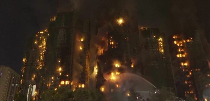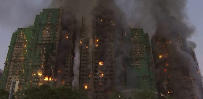 Пожарот се проширил на бамбусовите скелиња околу надворешноста на облакодерот, а пожарникарите се обидувале да го локализираат пламенот користејќи скали и вода од висина.