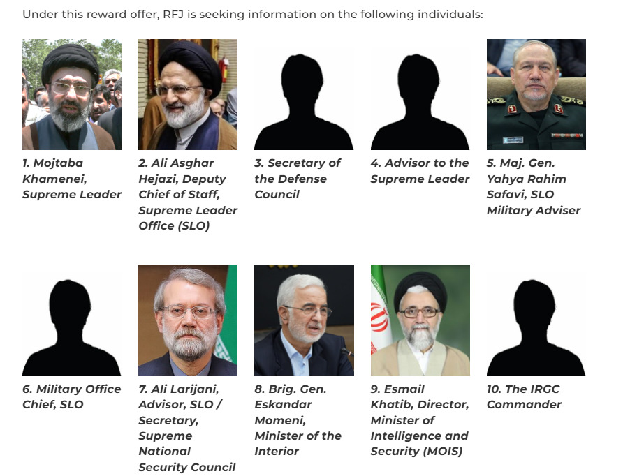 Програмата „Награди за правда“ (Rewards for Justice) на Стејт департментот на САД повика на информации за „иранските терористички лидери“, вклучувајќи го и Моџтаба Хамнеи.