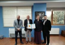 Никола Ѓурѓај, претседателот на македонско друштво „Илинден“-Тирана, врачи благодарница „Илинден“ на…