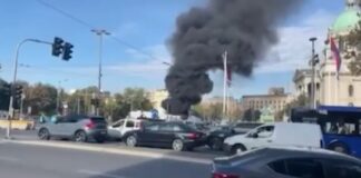 Пожар избувнал претпладнево пред српскиот Парламент во Белград каде се поставени шатори. Пожарникарите го гаснат со три возила.