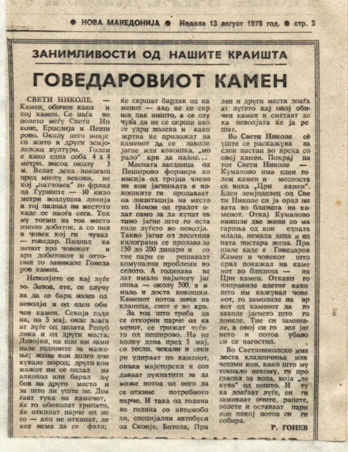 За Говедар камен пишувал долгогодишниот дописник на „Нова Македонија“ од Свети Николе, Ристо Гонев. Го пренесуваме неговиот текст во целост заедно со оригинален фототип од написот.