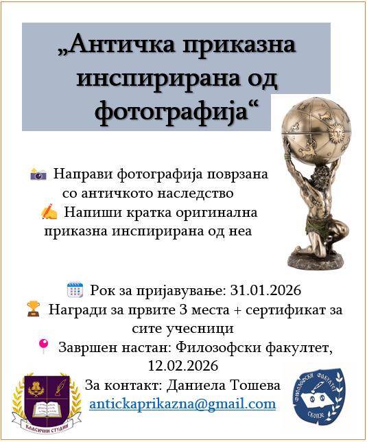 По повод 105-годишнината од постоењето на Филозофскиот факултет во Скопје, Институтот за класични студии организира натпревар за учениците од средните училишта во Македонија, насловен „Античка приказна инспирирана од фотографија“.