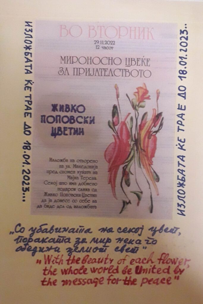 Перформансот, кој ќе се одржува со 18 јануари, 2023 година, се состои во спонтан собир на учесниците на улица Македонија, пред спомен куќата на Мајка Тереза, каде ќе бидат изложени сликите кои уметникот им ги подарува, додека пак тој ќе ја изложи својата „Цветна патека на мирот“ долга сто и еден метар.