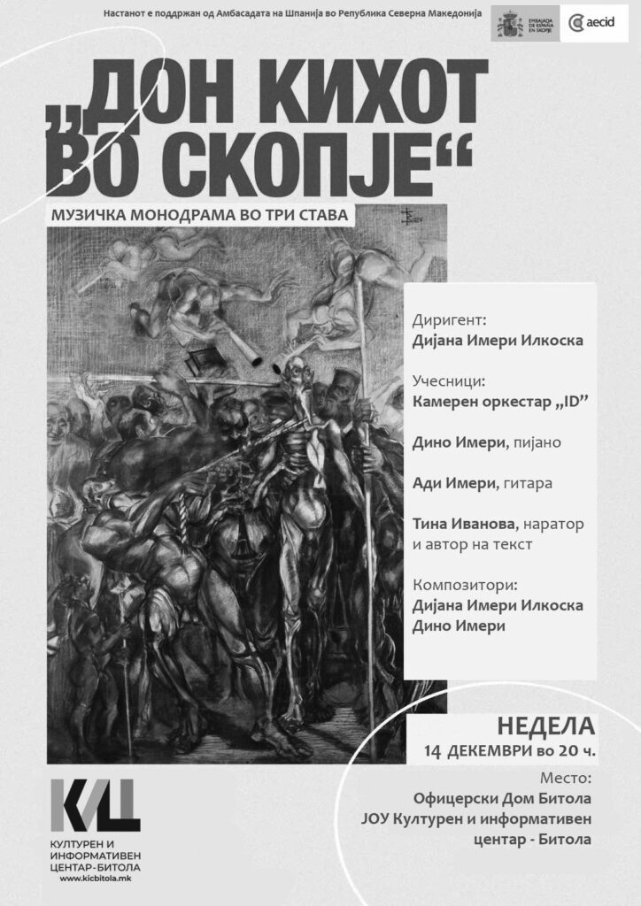 По фантастично успешната премиера во Скопје и меѓународната премиера во Париз, Франција, делото „Дон Кихот во Скопје“ ќе ја има и својата битолска премиера. В недела, во Офицерскиот дом во Битола, со почеток во 20 часот, овој разновиден проект инспириран од култната приказна за славниот витез Дон Кихот на Мигел де Сервантес ќе биде претставен и пред битолската публика.
