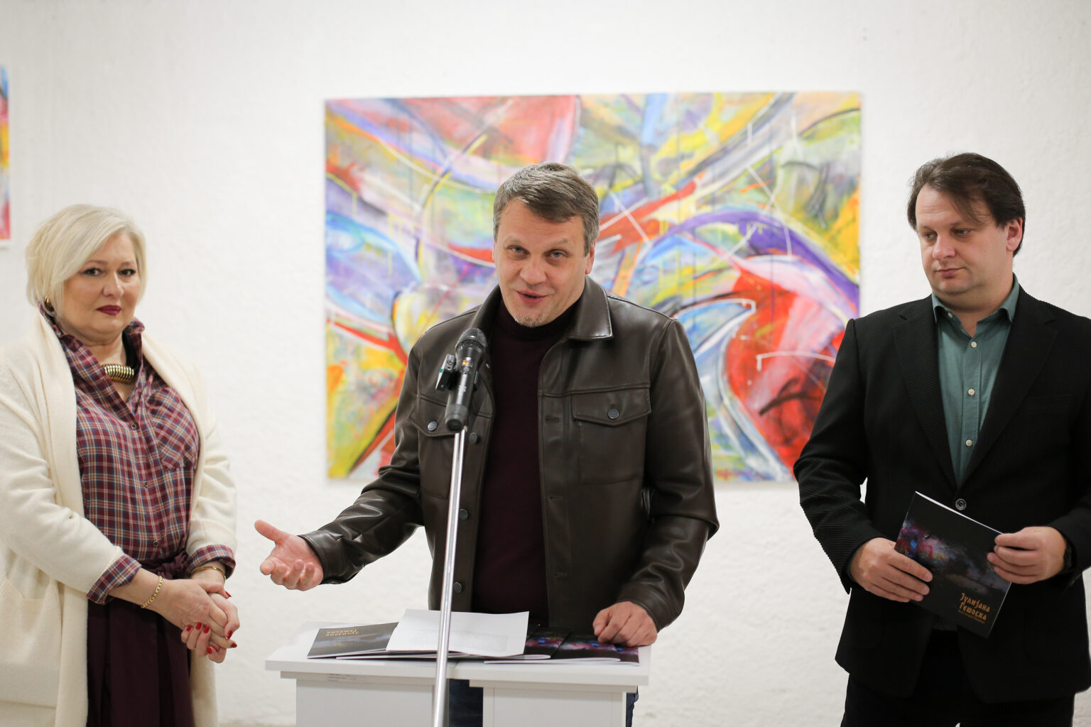 Изложбата на Јулијана Гешоска претставува извонреден пример на апстрактен експресионизам каде енергијата на бојата, импулсивноста на потезот и драматичноста на линијата создаваат визуелен виор.