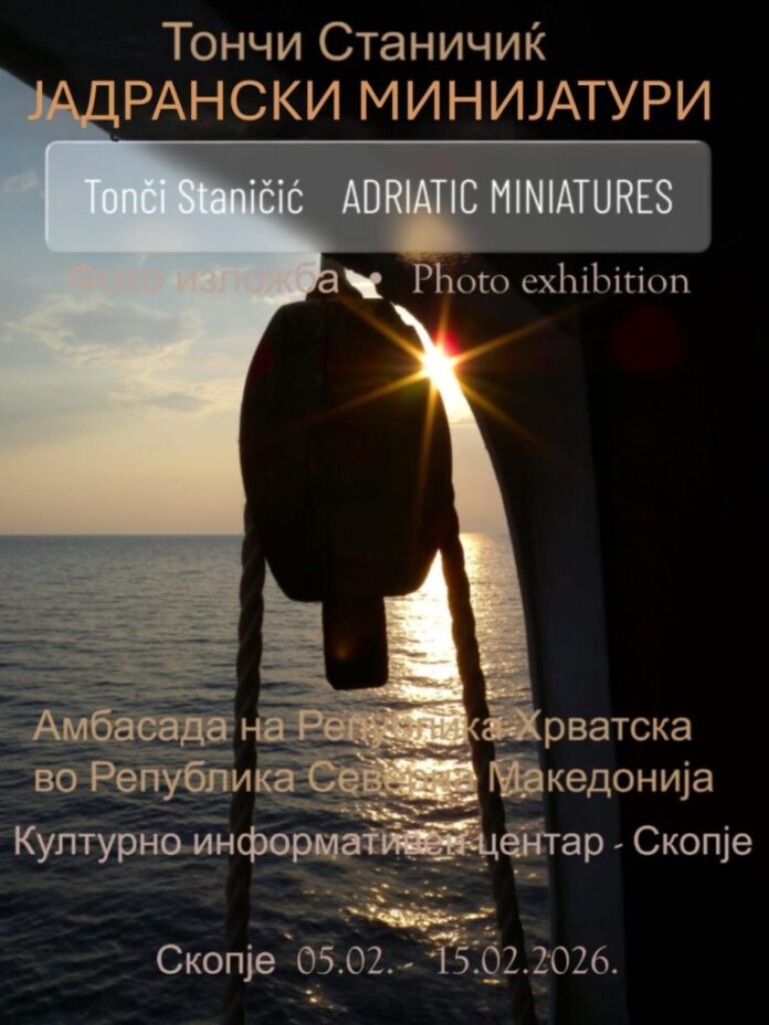 Во галеријата „Империјал 1“ при Културно-информативниот центар во Скопје, на 5 февруари, со почеток во 18часот и 30 минути, ќе биде отворена изложбата на фотографии „Јадрански минијатури“ на Тончи Станичиќ.