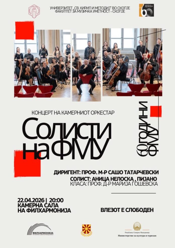 Факултетот за музичка уметност при Универзитетот „Св. Кирил и Методиј“ во Скопје организира концерт на Камерниот оркестар „Солисти на ФМУ“, кој се реализира во рамки на одбележувањето на 60-годишнината од основањето на Факултетот за музичка уметност.