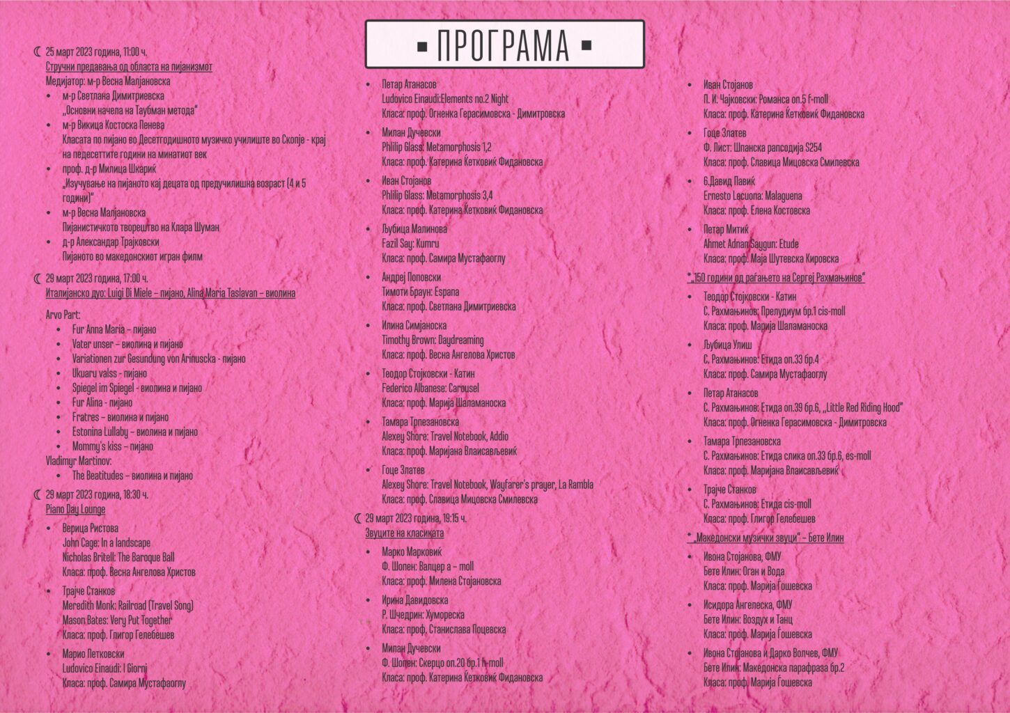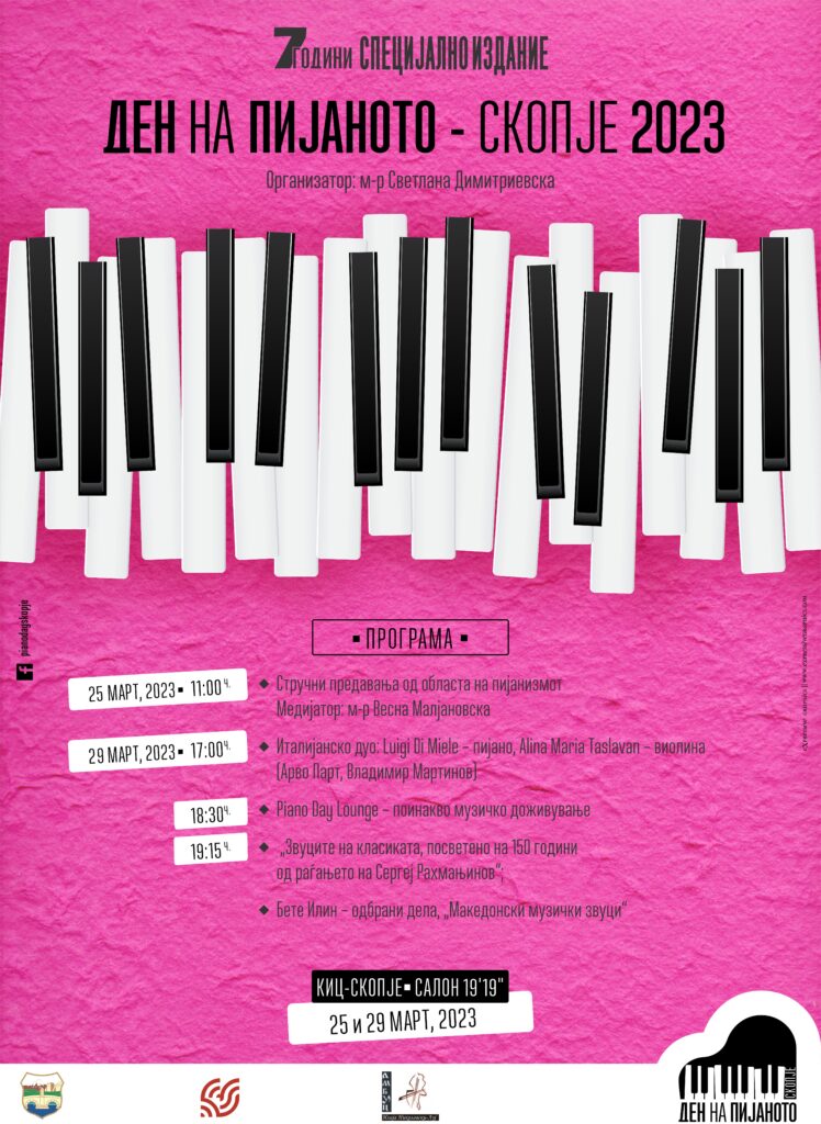 На 25 март, со почеток во 11 часот, ќе има стручно предавање од областа на пијанизмот, на кое медијатор ќе биде м-р Весна Малјановска. На 29 март во 17 часот ќе настапи дуото Луиџи ди Миеле – Алина Таславан, во 18.30 часот ќе се одржи Piano Day Lounge, а во 19.15 часот „Звуците на класиката – посветено на 150-годишнината од раѓањето на композиторот Сергеј Рахмањинов и Бете Илин – Одбрани дела „Македонски музички звуци“.