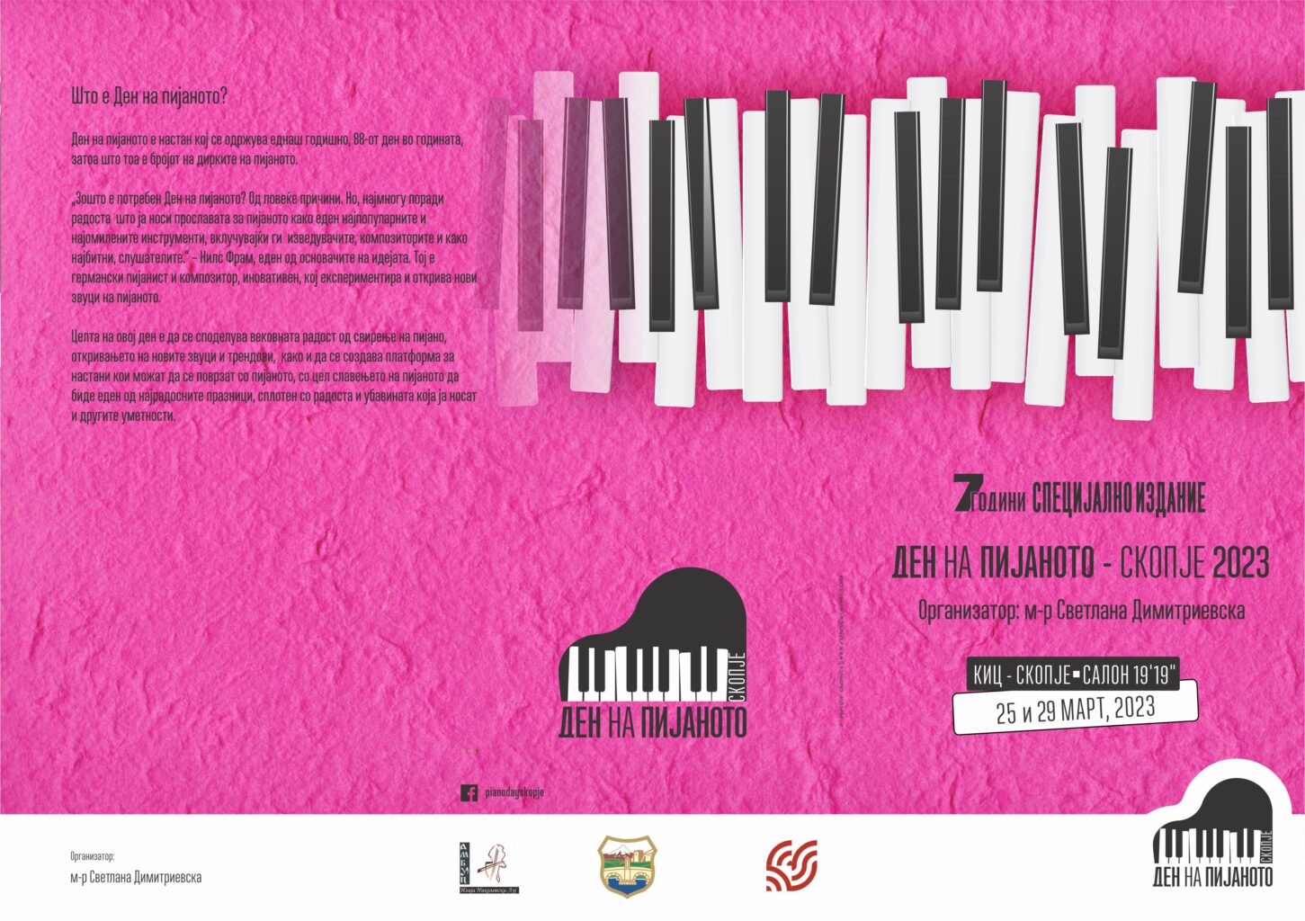 – Ова е настан кој ги инспирираше сите вљубеници да го прифатат и слават овој празник. Голема чест е да се биде пример и инспирација во Македонија. За мене како организатор е голем предизвик, затоа што светот и музиката се менуваат, се менува презентирањето, доживувањето, трендот. Ние треба да го живееме нашето време и преку музичките трендови и достигнувања – вели организаторката м-р Светлана Димитриевска, професорка и раководител на одделот за пијано во ДМБУЦ „Илија Николовски-Луј” од Скопје.