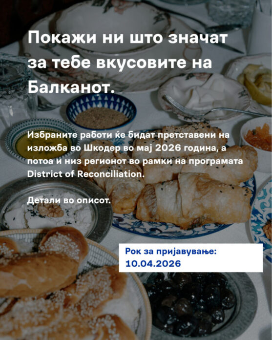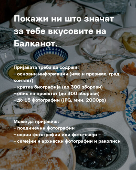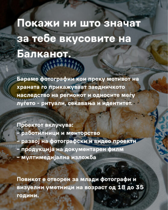 Проектот „Сликите на вкусот (Frames of Flavours)“ објавува отворен повик за млади уметници и фотографи (18-35 години) од Македонија, Србија, Црна Гора и Албанија. Оваа регионална иницијатива го истражува дијалогот помеѓу генерациите и културите преку еден од најсилните заеднички јазици на Балканот – храната.