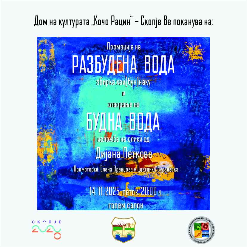 Во Домот на културата „Кочо Рацин“ – Скопје на 14 ноември 2025 година ќе се одржи промоцијата на збирката „Разбудена вода“ и ќе се отвори ликовната изложба „Будна вода“ со дела на Дијана Петкова. Настанот ќе започне во 20 часот во големиот салон, а промотори се Елена Пренџова и Цветанка Бурзовска.