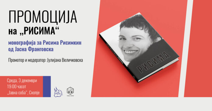 Промоцијата на монографијата „Рисима“ од Јасна Франговска, посветена на најпознатата и најуспешна македонска кореографка за современ танц ‒ Рисима Рисимкин, е закажана за в среда, од 19 часот, во „Јавна соба“. Изданието е на „ПНВ публикации“ и е објавено со поддршка од Министерството за култура и туризам.