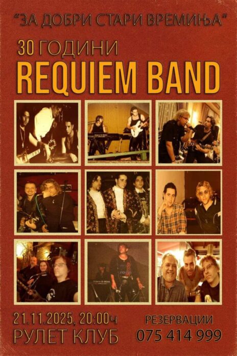 Почитувани пријатели, другари, стари и нови фанови, на чекор сме до нашата голема прослава – 30 години постоење на „Реквием бенд“. На 21 ноември, петок, ќе го прославиме јубилејот заедно со сите вас, за кои и постоиме сите овие години. Свирката ќе се случи во „Рулет клуб“, местото каде што и почнавме пред три децении, на 17. септември.