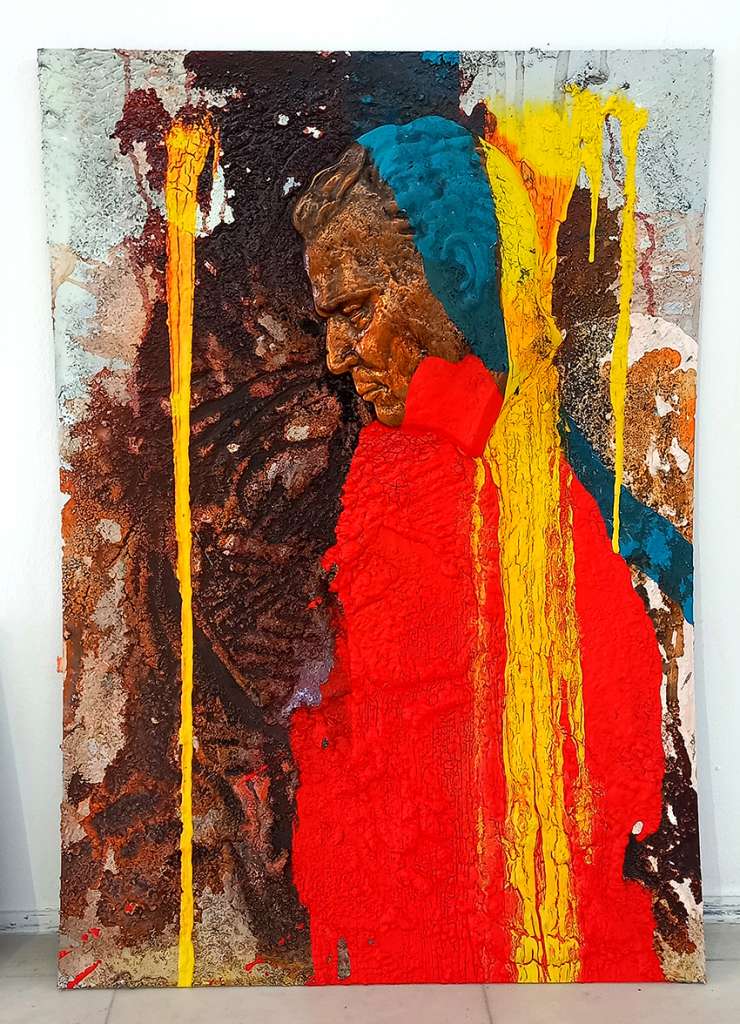Станува збор за 30-тина уметнички слики на картон со акрилна боја и колажи од стари историски книги, мапи, карти, атласи, постери, образовни графикони…