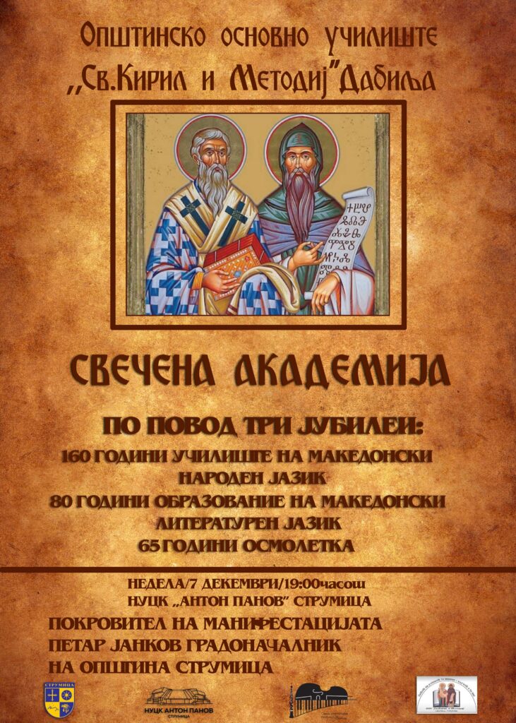 Свечената академија ќе се одржи по повод три јубилеи на Општинското основно училиште „Св. Кирил и Методиј“ – Дабиље, Струмица, в недела, во 19 часот, во НУЦК „Антон Панов“. Шеесет години училиште на македонски народен јазик, 80 години образование на македонски литературен јазик и 65 години осмолетка се трите значајни јубилеи на училиштето.