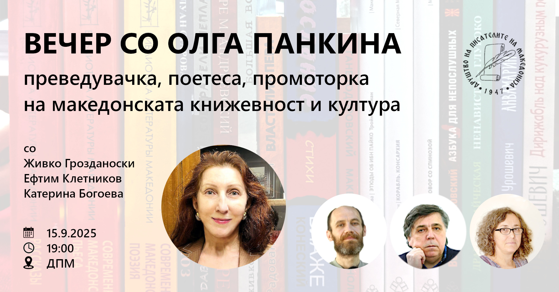 Во Друштвото на писателите на Македонија денеска, во 19 часот, ќе се одржи Вечер со Олга Панкина – преведувачка, поетеса и промоторка на македонската книжевност и култура. Наедно, со оваа вечер ќе бидат одбележани два значајни јубилеја: педесет години од основањето на Лекторатот за македонски јазик во Московскиот државен универзитет „Ломоносов“ и петнаесет години од отворањето на Македонскиот културен центар во Москва.