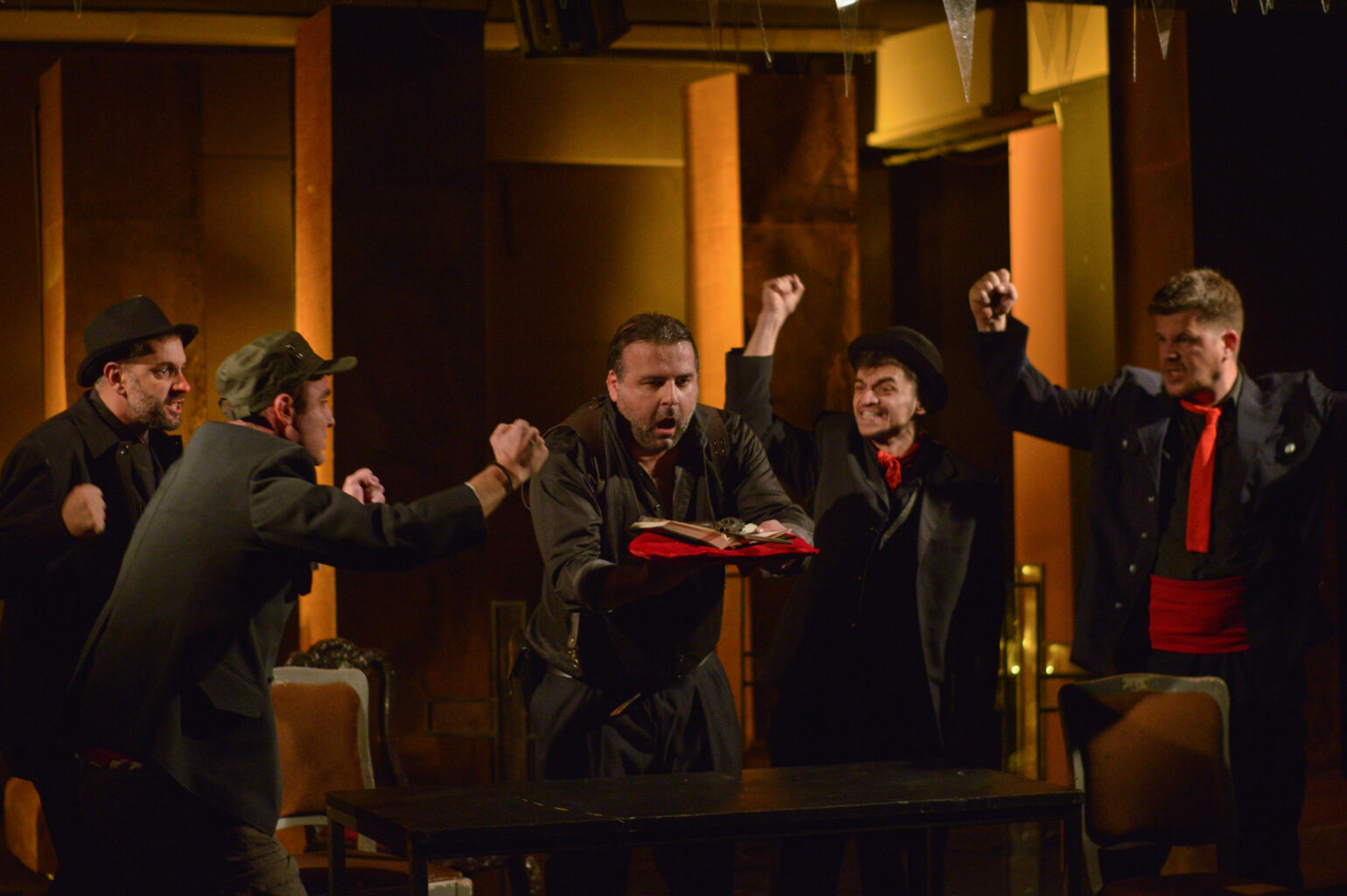 Во претставата играат: Како Неда, Сара Спиркоска, во улогата на Иван, Бобан Алексоски, Катерина Чакмакоска-Клинческа како Милка, Александар Степанулески како Луков, Христов го игра Александар Тодески, ликот на Фезлиев е Димитар Ѓорѓиевски, како Методи, Михајло Миленкоски, Младичот е Илија Волчески, како и децата Иво Ачански, Ангелина Тодеска, Давид Кочоски и Ива Малинческа.