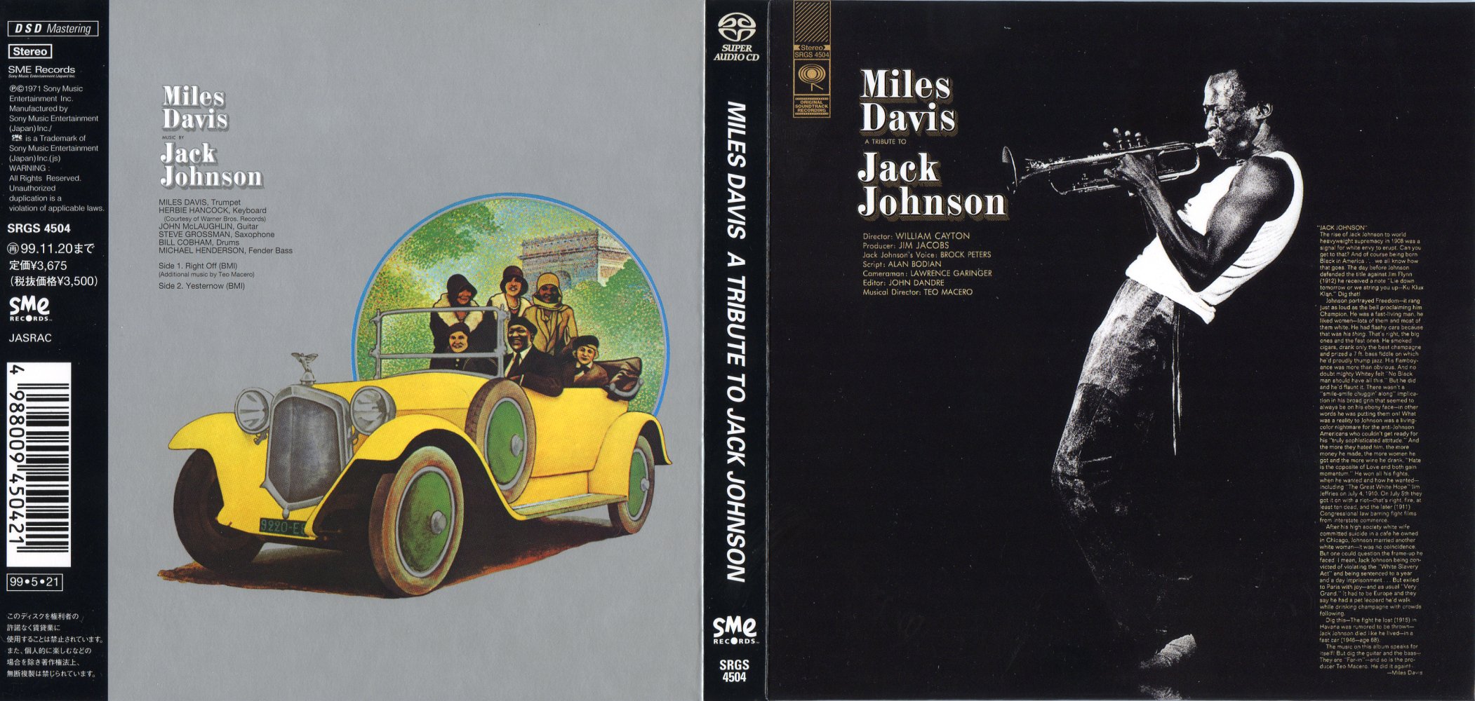 Мајлс Дејвис, еден од најголемите иноватори во музиката, посебно во џезот и фузијата на рок-џез-фанк музиката, на 7 април во 1970 г., во „Колумбија студио“ во Њујорк го сними најголемиот рок-албум создаден од џез-музичар под наслов „A tribute to Jack Johnson“. За инает на рокерите и на Џими Хендрикс, кој важи за еден од неговите најголеми пријатели, всушност за да им докаже дека може најдобро, Дејвис (музичарот со најголемо его) го создава овој архетипски рок-албум со примеси на сѐ и сешто, но најмногу на џез. Се собира најдобрата и најимпресивна рок/џез група на сите времиња составена од неверојатни индивидуалци: Мајлс Дејвис – труба, Стиви Гросман – саксофон, Џон Меклафин – електрична гитара, Херби Хенкок – органа, Мајкл Хендерсон – електричен бас, Били Кобам – тапани, Бени Мапин – бас-кларинет, Чик Кореа – електрично пијано, Дејв Холанд – електричен бас, Џек Деџонет – тапани, Брук Питерс – нарација, Тео Мацеро – директор. Некои од овие музичари се цело време вклучени, а некои од нив повременo импровизираат. Така, на пример, Херби Хенкок случајно влегол во студиото каде што снимале и почнал да свири на органата создавајќи звуци што Мајлс ги вметнува во неговите идеи и замисли. Албумот е преполн со експериментирање, музичка магија, дисхармонија на звуци и ритми, тотален напад на сите сетила, а музичарите при самото создавање не се свесни што создале, тие само си играле како децата кога откриваат нешто ново. Сето тоа го канализира Мајлс. Тој е цело време присутен со својата енергија, иновативност и немилосрдна визија, создавајќи своја вселена што ја споделува со публиката. На почетокот никој не е свесен што се создава, ни критиката, ни публиката, па ни самите музичари, но со текот на времето станува јасно дека станува збор за вонвременско дело. Во 2003 г. излегува „A complete Jack Johnson“, комплетниот снимен материја со шест часа музика сместени во сет од пет цедиња.