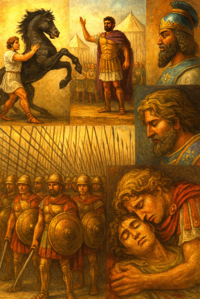 Букефал, јавното прикажување на наследникот, реформите на Филип Македонски, персискиот синкретизам и пријателство со Хефестион се делови од иста сложена приказна за создавање и одржување моќ во Античка Македонија. Во таа приказна личниот гест, јавниот ритуал, институционалната дисциплина, културната адаптација и интимните сојузи не се одвоија едни од други туку се преплетоа и меѓусебно си ги потврдуваа значењата. Со помош на неколку сцени – смирувањето на дивиот коњ, прикажувањето во кампот, реформите што ја оформија македонската армијата во воена машина, прифаќањето на персиските дворски обичаи и јавните изрази на пријателството – можеме да го согледаме човечкиот и практичен лик на македонската моќ.