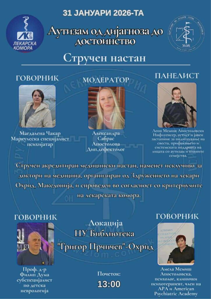 Стручен настан за доктори на медицина со наслов „Аутизам од дијагноза до достоинство“ се одржа во библиотеката „Григор Прличев“ во Охрид. Овој акредитиран медицински настан беше посветен на аутизмот и наменет исклучиво за доктори на медицина. Настанот ги продлабочи знаењата за патот на лицата со аутизам, од дијагноза до достоинствен живот, со системска поддршка.
