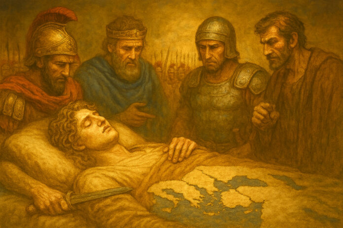 Александар починал во 323 г. пр. н.е. во Вавилон, на само 32 години. Неговата смрт била ненадејна и оставила огромна празнина. Тој не назначил јасен наследник – неговиот син Александар IV бил уште нероден, а полубратот Аригeј бил неспособен за владеење. Така, империјата останала без силна рака што ќе ја држи обединета.